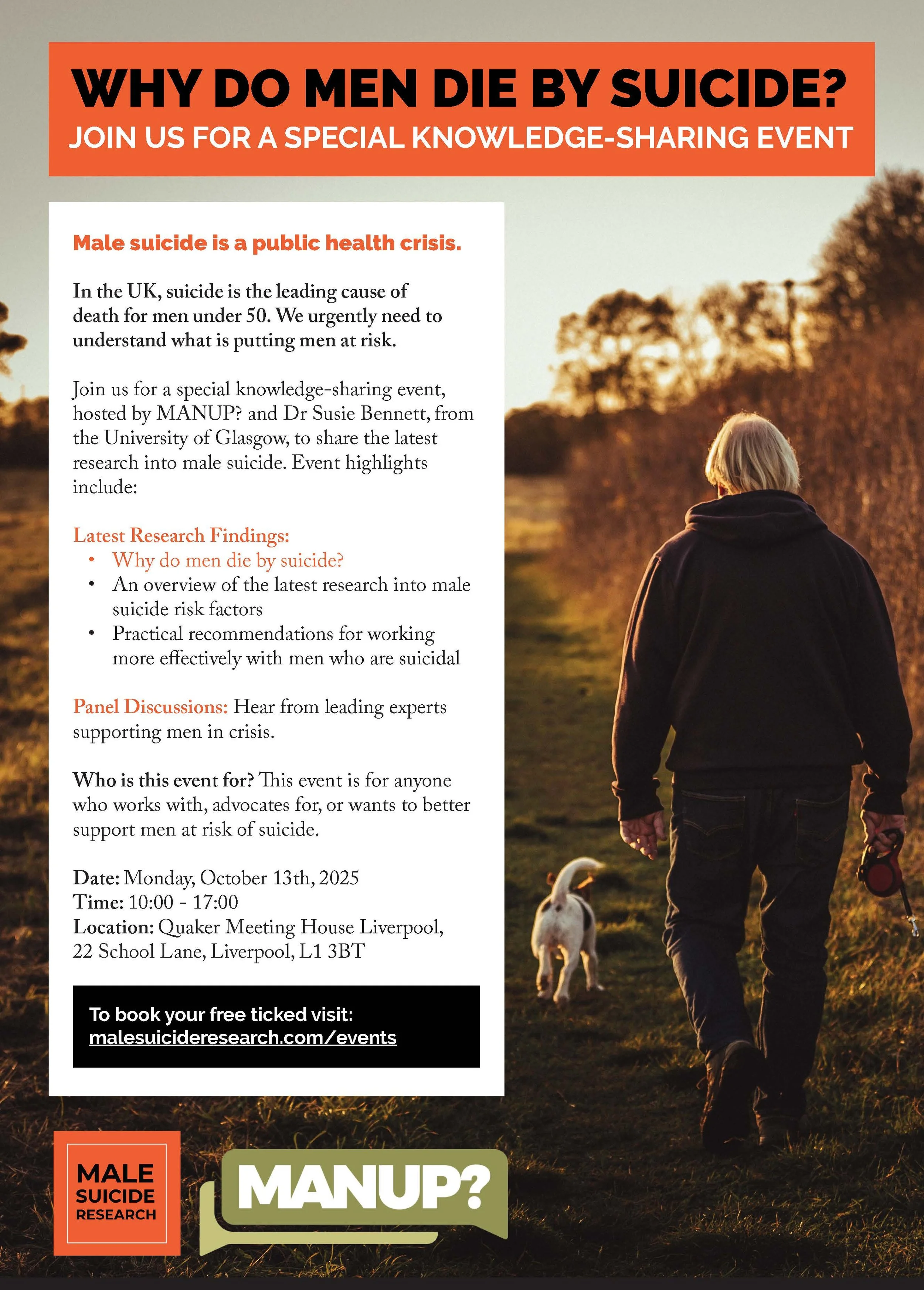 This one-day event brings the latest research funded by MANUP? into public view. Dr Susie Bennett from the University of Glasgow will share her findings on the risk factors behind male suicide, alongside panel discussions with frontline professionals who support men in crisis.